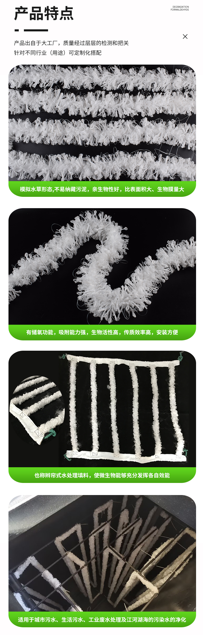 辮帶式水處理填料是新一代環保型生物活性填料,模擬天然水草形態,不易納藏污泥,充氧時管狀直徑具有可變性,無堵塞;具有親水、親油、對氣泡有很好的切割作用,有儲氧功能,吸附能力強;同時由于受水流和氣流的沖動